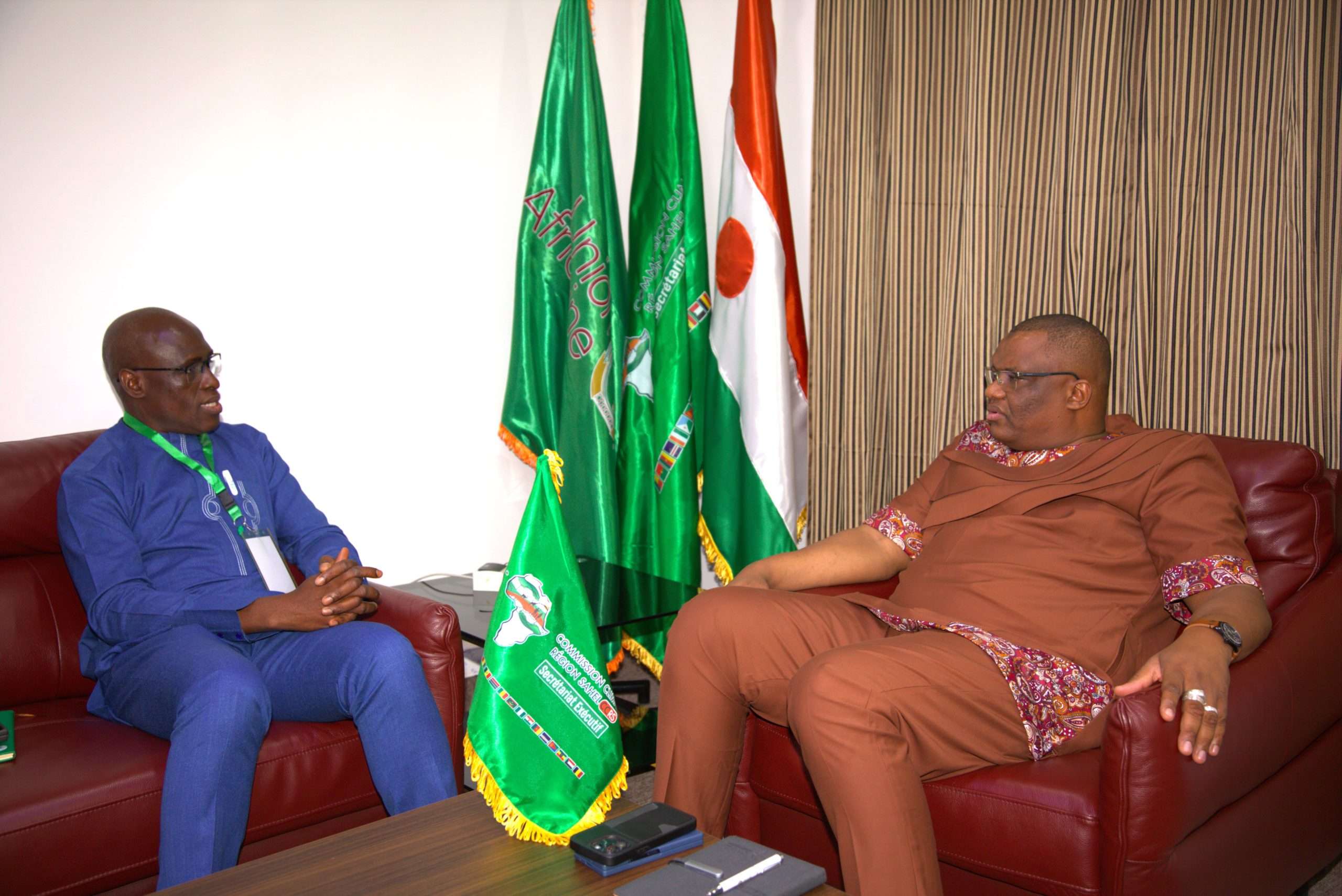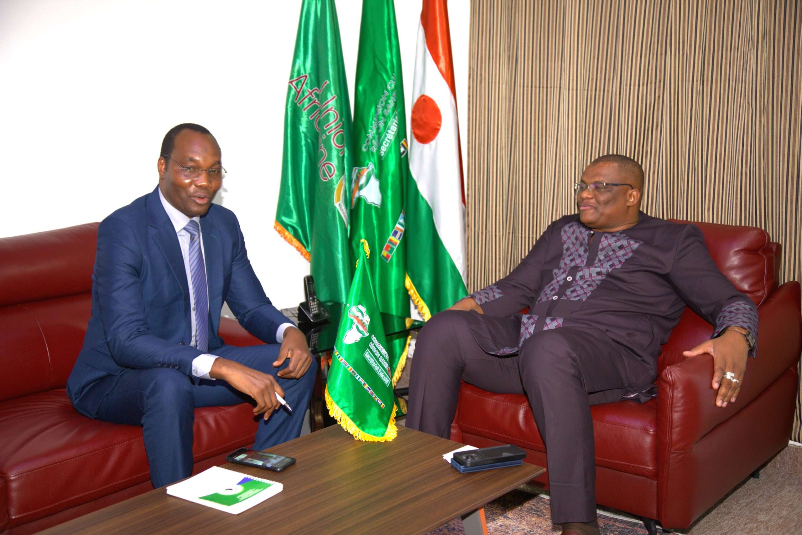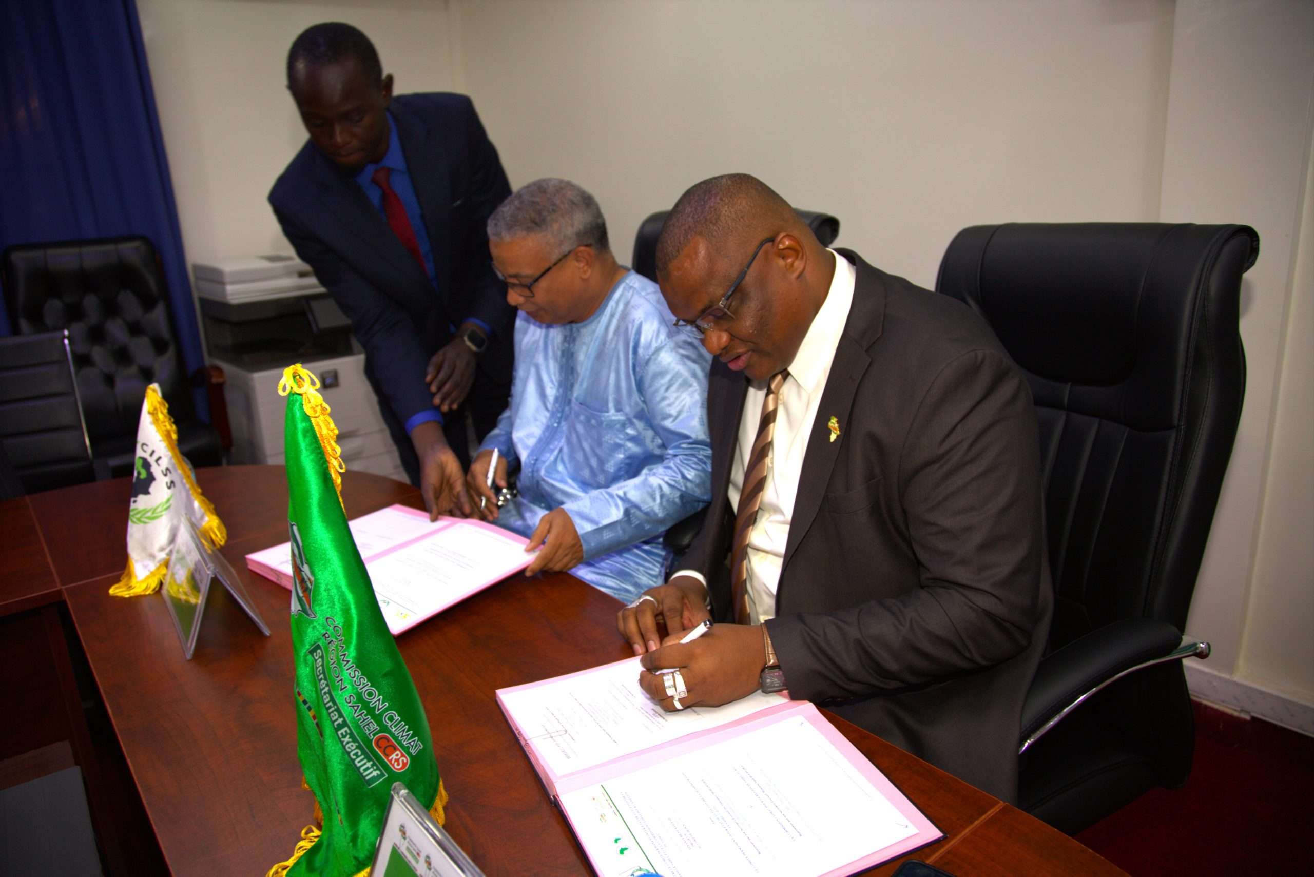 Ce mardi 10 septembre 2024, le Secrétaire Exécutif de la Commission Climat pour la Région du Sahel (CCRS), SEM. Issifi Boureima a procédé avec Dr Abdoulaye Maiga Mohamadou Secrétaire Exécutif du CILSS, à la signature d’une convention entre les deux Institutions dans le cadre la mise en œuvre de la composante régionale du Projet 2 du Programme de renforcement de la résilience à l’insécurité alimentaire et nutritionnelle au sahel (P2-P2RS), dont le CILSS assure la coordination et financé par le Groupe de la Banque Africaine de Développement (BAD). Étaient également présents pour la circonstance Monsieur Bilgo Ablasse, Task Manager du P2-P2RS, Représentant la BAD ; Dr Hubert NDjafa Directeur Général de l’Institut du Sahel et Monsieur Hinsa Adamou, Coordonnateur du Projet P2-P2RS au titre du CILSS. Cette convention a pour objectif de définir d’une part, les modalités de mise en œuvre des activités d’appui à l’opérationnalisation de la Commission Climat pour la Région du Sahel et d’autre part, de déterminer les mécanismes d’accès pour l’opérationnalisation des activités programmées en lien avec l’Unité Régionale de Coordination et de Gestion du Programme (URGP). Le montant de cette convention est de trois cent cinq millions quatre cent vingt- quatre mille (305 424 000) FCFA à mettre à la disposition à la CCRS pour le financement des activités qui s’articulent autour des aspects essentiels suivants : ➡️ Élaboration d’une cartographie des actions de résilience au Sahel ; ➡️ Appui au système Suivi-évaluation sensible au genre de la mise en œuvre du Plan d’investissement climat pour la région du Sahel (PIC-RS) ; ➡️ Appui à l’opérationnalisation du Fonds climat pour la résilience du Sahel ; ➡️ Appui au renforcement des capacités des instances de coordination, de suivi technique et de mise en œuvre ; ➡️ Appui à l’élaboration de projets bancables cohérents au Programme Prioritaire pour Catalyser les Investissements climatiques au Sahel (PPCI Sahel) ; ➡️ Appui à l’organisation de fora annuels d’investissement climat au Sahel ; ➡️ Élaboration d’une stratégie de plaidoyer et de communication assortie de son plan d’actions. En plus de ces activités, la CCRS porte également d’autres activités dans le cadre ce projet et dont le financement est assuré directement par la BAD. SEM. Issifi Boureima a saisi l’occasion pour saluer au nom de l’ensemble des parties prenantes de la Commission le Secrétaire Exécutif du CILSS et son équipe pour l’exemplarité de leur collaboration. Il a également saisi l’occasion pour remercier l’équipe de la Banque Africaine de Développement (BAD) pour leur engagement soutenu à œuvrer pour la poursuite de l’appui à l’opérationnalisation de la CCRS.